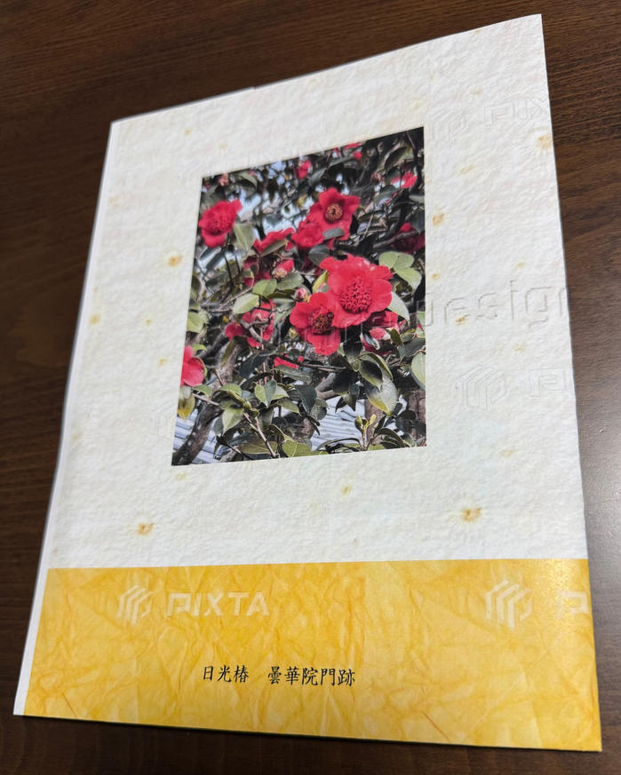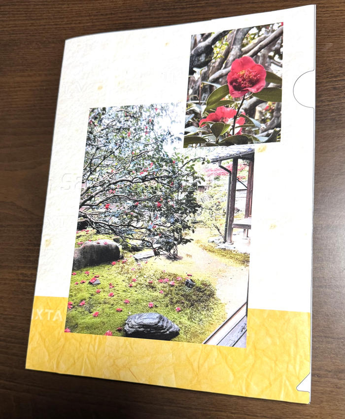 - 日光椿と打敷のデザインのクリアファイル(A4サイズ)です。ご支援くださった方には、住職より感謝の気持ちを込めて、御朱印とお礼状をお送りします。