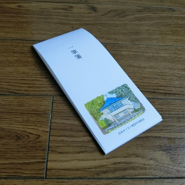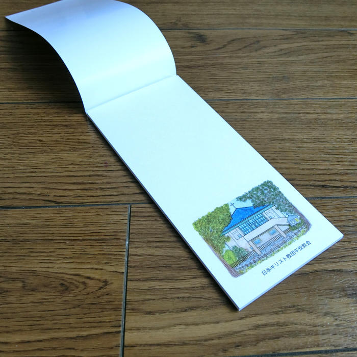 - 上質紙30枚つづりの一筆箋です。罫線はないので縦書きも横書きもできます。柏木牧子さんによる新しい教会堂のイラスト入り。