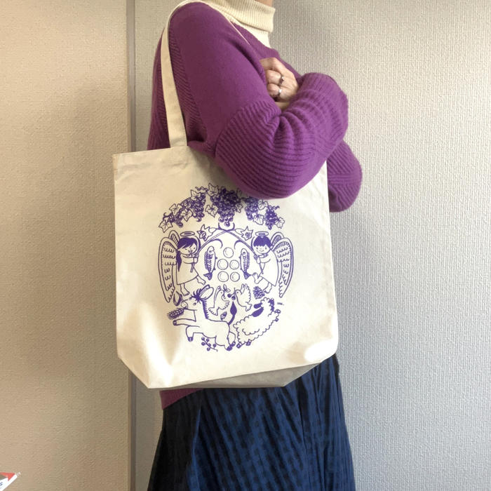 トートバッグは、ポストカードの絵柄の1種類をモノクロでシルクスクリーン印刷したコットンバッグで聖書のモチーフがちりばめられています。