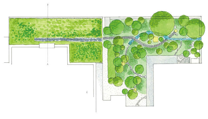 - その方丈の東側で、大きな空を有する本堂広場は、伸びやかな芝庭に仕上げます。