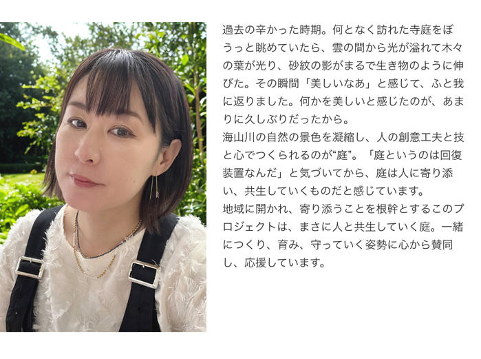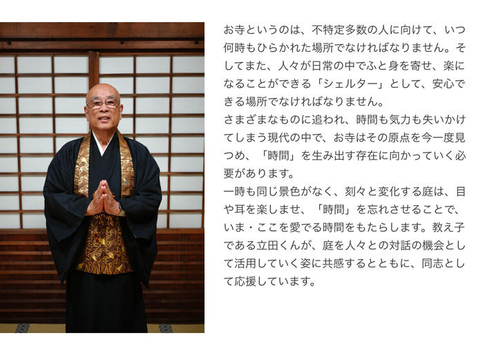 - 教育の現場に携わってきた身として、学校のルーツにあたるお寺の「学びの場」としての価値をひらき続けたい。生涯学習の舞台として、寺と庭を見つめています。