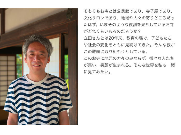 家でも学校でも職場でもない。その中間のようなところにあるお寺だからこそ、出会える人がいて、学べるものや遊べることがある。それはお寺が地域にひらくことができる大事な場面ではないかと思います。
