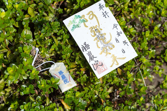 - 新たに生まれ変わるお庭を記念した特別御朱印と勝巖院オリジナルの「勝守り」をセットでお送りさせていただきます。御守りは、お寺のはじまりのきっかけとなった直姫が、戦に出向く身寄りの無事(戦勝)を祈っていたという言い伝えから作られたものです。